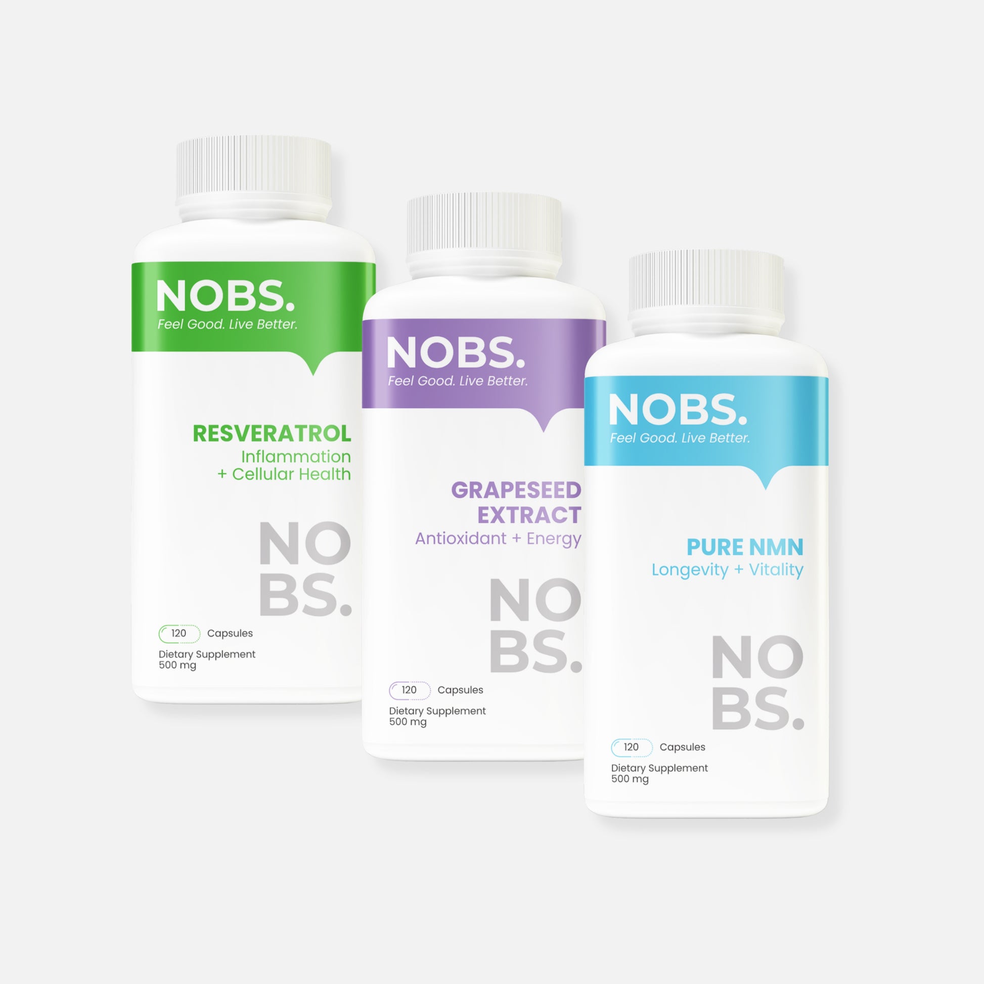 You get our 3 core essentials: NMN, Resveratrol, and Grapeseed Extract. It’s a powerful, science-backed stack designed to fuel energy, boost cellular repair, support heart health, and protect you from oxidative stress — helping you age with more vitality and intention.