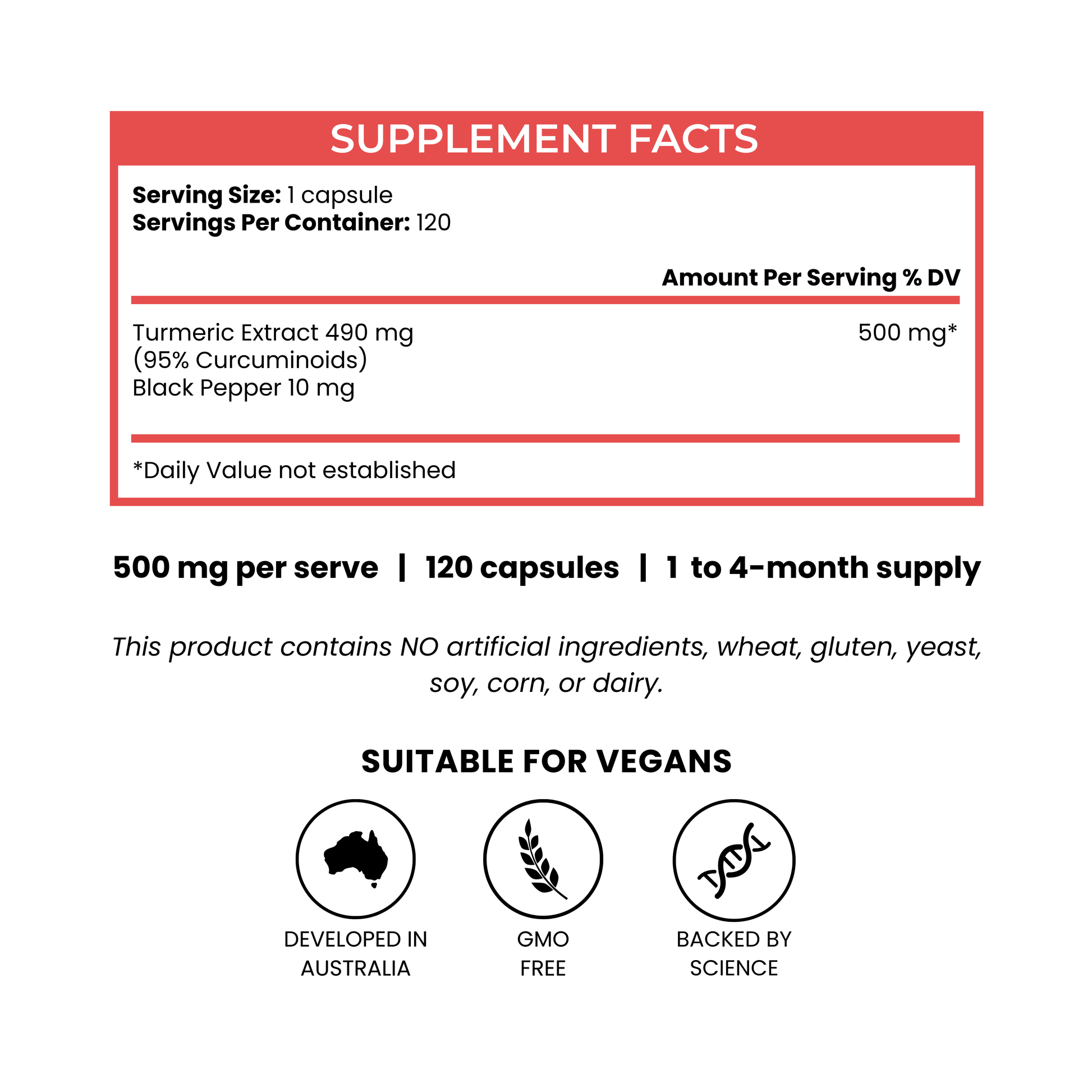 Our formula is a high-potency curcumin extract (up to 95%), compared to only 2–9% curcumin found in cooking turmeric. We also include absorption enhancers like piperine or fat-based delivery systems, crucial since curcumin alone has poor bioavailability.